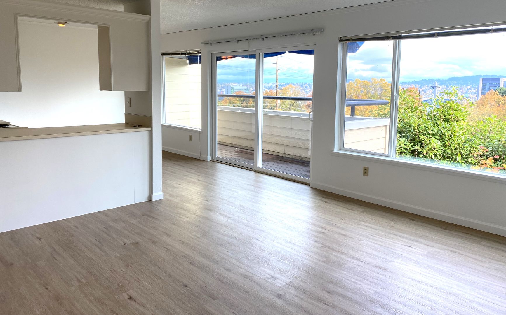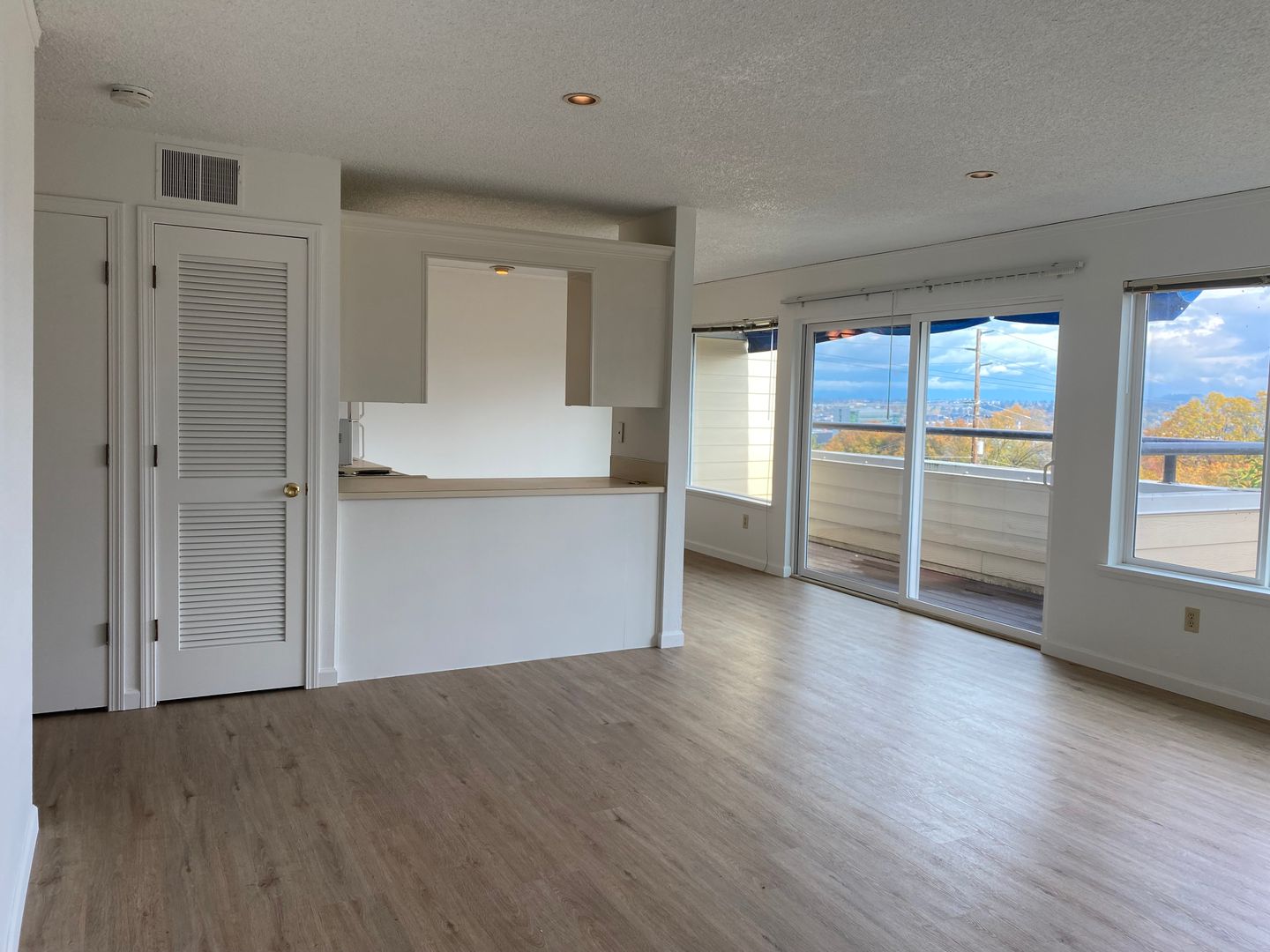 Fantastic location with amazing city & mountain views! Private covered deck to take it all in!! Just steps away from Under Amour Portland Headquarters and only minutes to Downtown. Spacious condo radiates of natural light! Completely rejuvenated unit features brand new wide plank flooring, bright white new interior paint and all new stainless steel kitchen appliance. Large closet in each bedroom. Updated bathroom with new vanity, new installed tub/shower insert and newer fixtures. Washer/dryer inside unit.