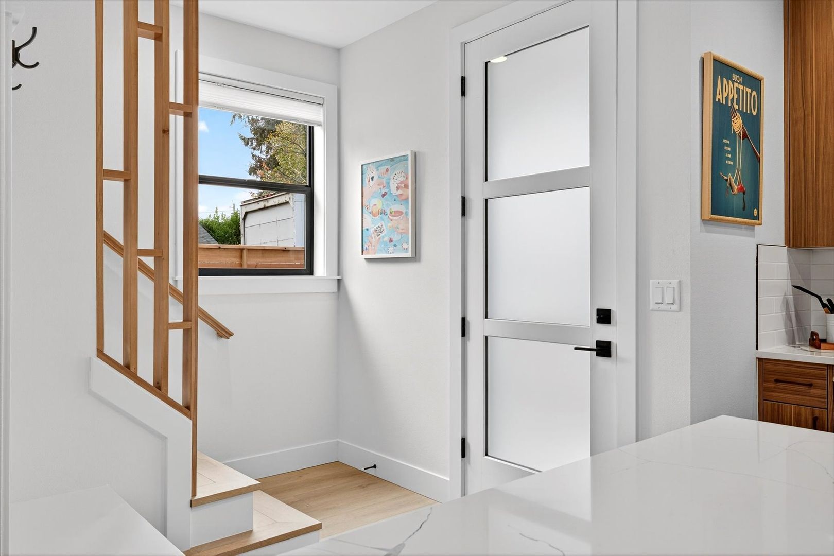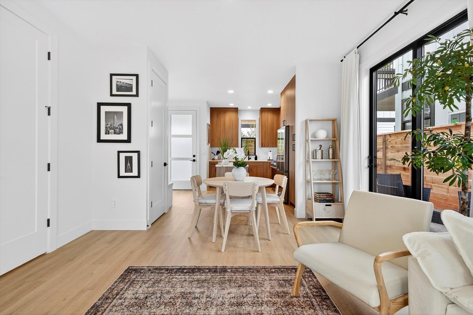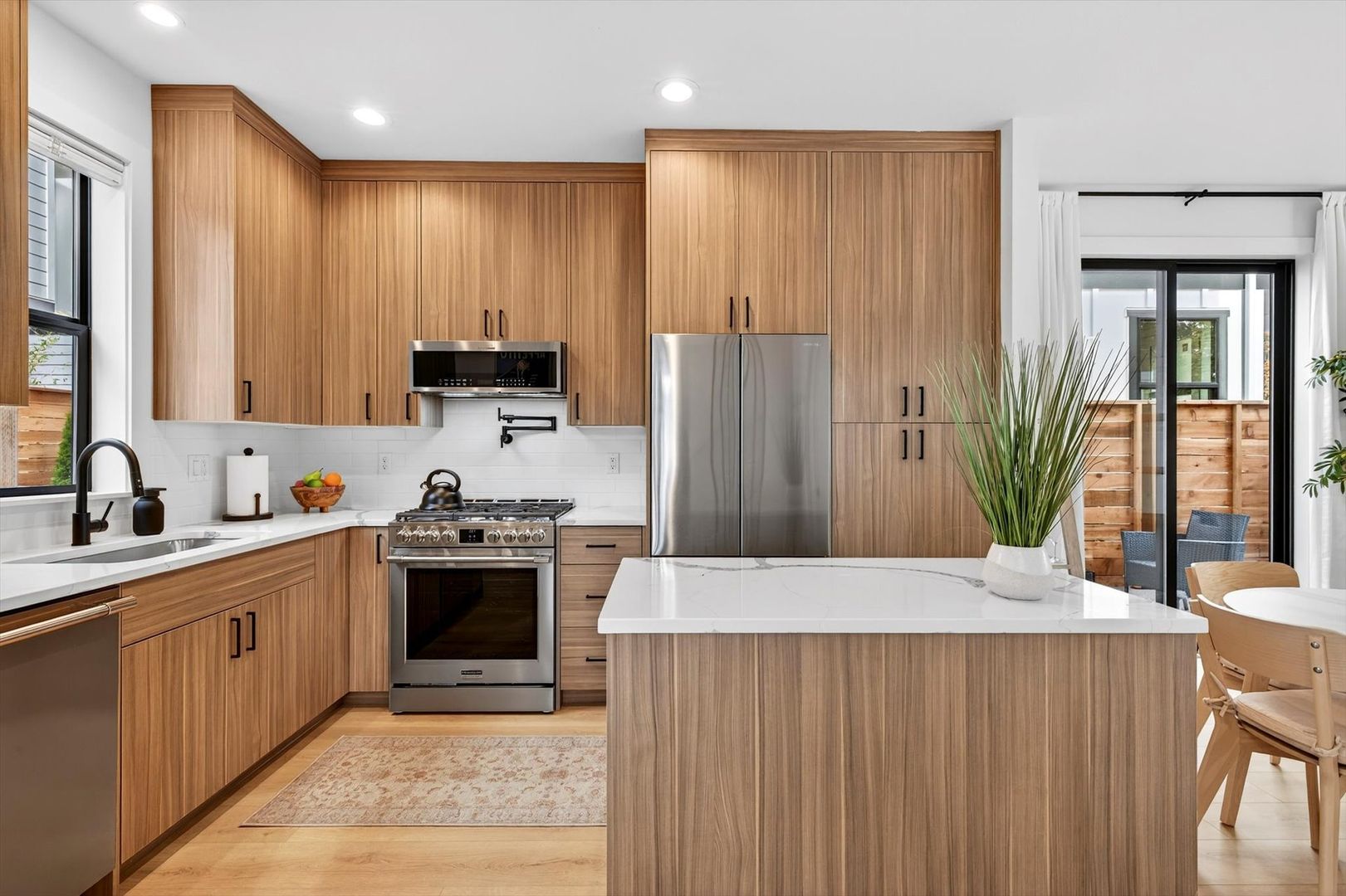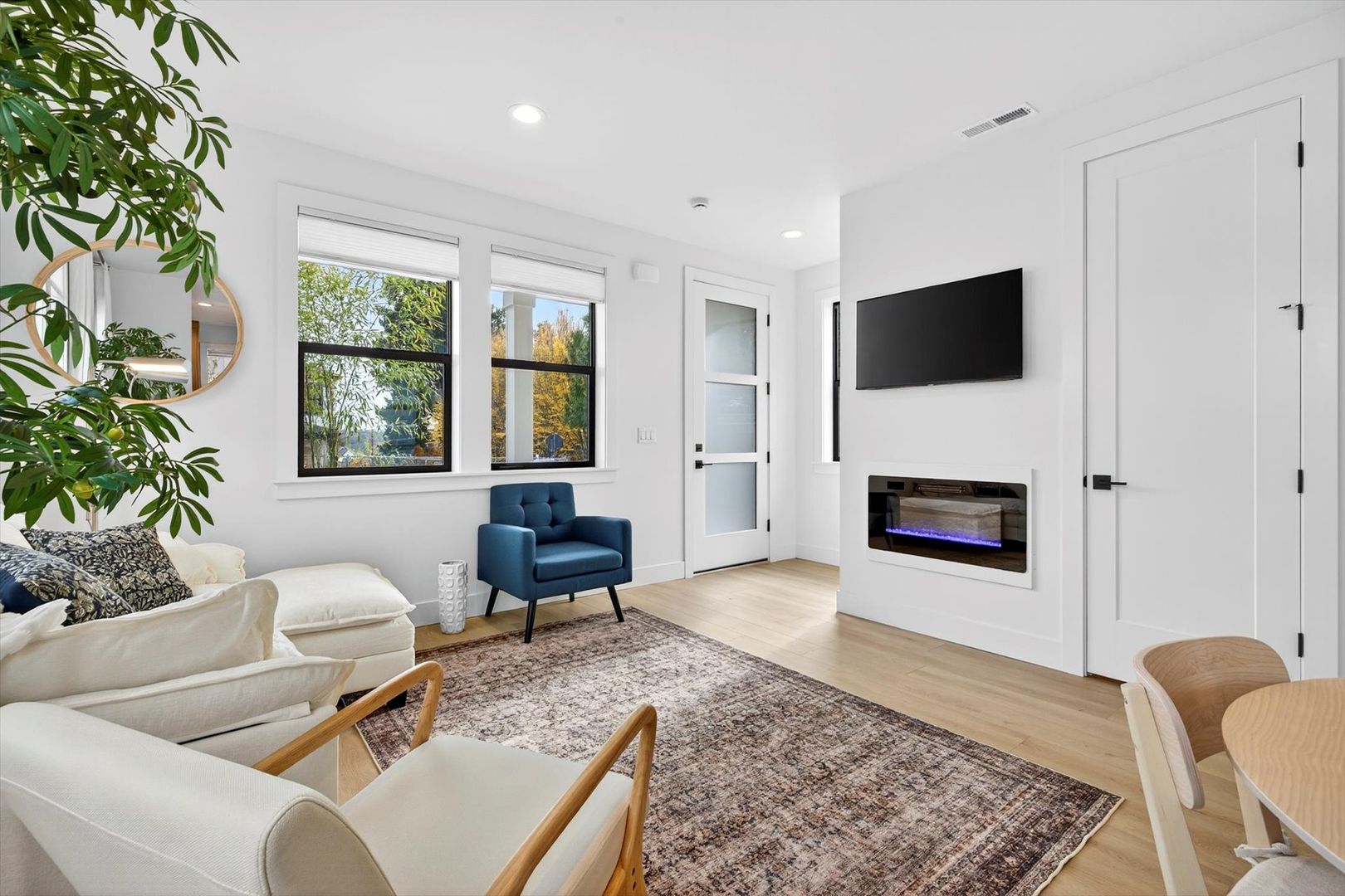 The open-concept layout is complemented by abundant natural light, wide-plank flooring, and designer finishes that blend rustic warmth with contemporary style. The kitchen serves as the heart of the home, showcasing sleek cabinetry, quartz countertops, and modern fixtures—perfect for both everyday living and entertaining.